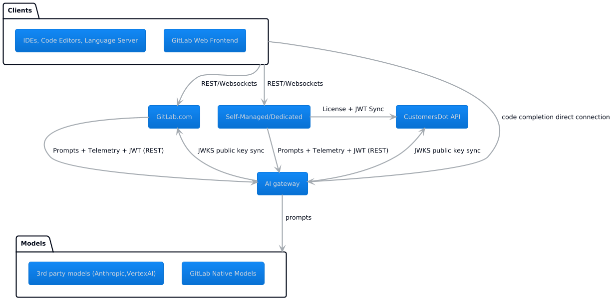 - AI Abstraction layer - Every GitLab instance (Self-Managed, GitLab.com, ..) contains an AI Abstraction layer which provides a framework for implementing new AI features in the monolith. This layer adds contextual information to the request and does request pre/post processing.