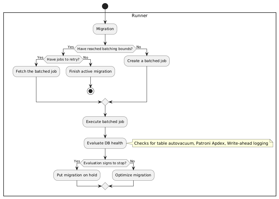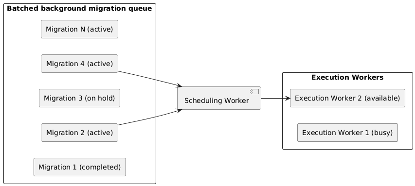 Batched background migrations are picked from the queue in the order they are enqueued. Multiple migrations are fetched and executed in parallel, as long they are in active state and do not target the same database table. The default number of migrations processed in parallel is 2, for GitLab.com this limit is configured to 4. Once migration is picked for execution, a job is created for the specific batch. After each job execution, migration's batch size may be increased or decreased, based on the performance of the last 20 jobs.